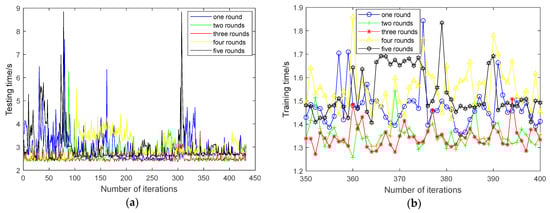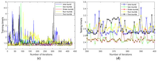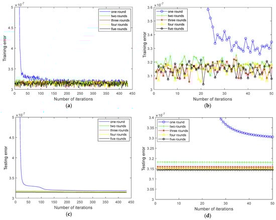 In the process of training the regularization parameter regression network, 432 training samples are all iterated once in each round. After a sample is sent to the memory to complete an iteration, 5 samples are randomly selected from 68 testing samples (only for testing, and not participating in model training). Then, the training and testing errors are used to confirm the current training situation of this iteration. As shown in Figure 7 and Figure 8, when the number of rounds increases, the overall trends of time and error of the inner ring fault decrease. To illustrate the linear trend more clearly, these plots in the right panel are zoomed-in views of the plots in the left panel. It can be seen from Figure 7a,c that when the training process reaches the third round, compared with the first round, the training and testing times are significantly reduced. And they are slightly better than the second round. In addition, as shown in Figure 8, when the training process reaches the third round, the errors of the training and testing samples are significantly lower than those of the first round and the second round, and have little change compared with those of the fourth round and the fifth round. The above results preliminarily show that when the network training reaches the third round, the network model has been trained effectively. Therefore, the number of network training rounds is set as three rounds for the other experiments in this paper.