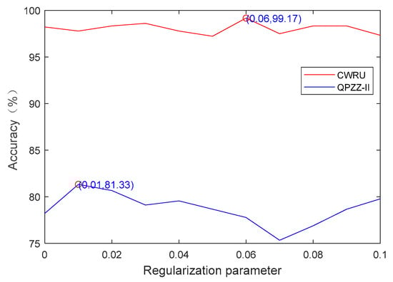 It can be seen from Figure 10 that the accuracies of fault classification fluctuate with the increase in the regularization parameter. Hence, it is very important for fault diagnosis to set the suitable regularization parameter value, which also shows the necessity of the research on the regularization parameter in this paper.
