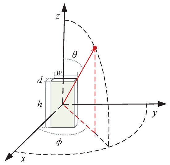 where is the wavelength. D and are the spherical diameter and cylindrical diameter, respectively. In principle, any part of the equipment can act as an active or passive radiator. Therefore, the calculation of the reference steps for the evaluation of the TRP of spurious emissions must be based on the entire device size, including the mechanical structure. The structure of the DUT in Figure 1 includes the depth (d), width (w), and height (h); then,