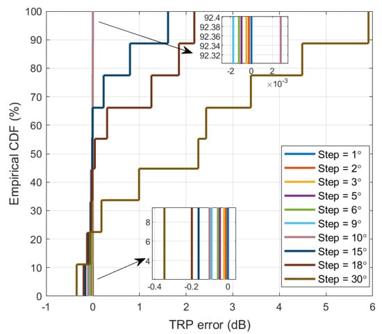 From the above analysis, it can be seen that the TRP mainly depended on the HPBW of the spurious beam and the sampling step. Therefore, we statistically analyzed the effect of the sampling step on the TRP with the SA-AS-TRP algorithm. Figure 5 and Figure 6 show the empirical cumulative distribution functions (CDFs) of the TRP error with different ranges of HPBWs for the spherical grid method. The TRP error is in Equation (11). Here, was calculated by using the spherical grid method with different sampling steps, and was calculated with the reference step in Equation (10). Specifically, the TRP error was made when not measuring a dense full sphere. In particular, the discretized grid adopted in this paper is . Although the is considered to be the most accurate TRP, some HPBWs may yield a smaller TRP when sampled at more suitable angles, resulting in a negative error value. This negative error is not expected to be significant, as it is primarily caused by the discretized grid method and computational errors. Generally, TRP values obtained from other sampling steps are greater than those obtained under the reference step, as a larger sampling step corresponds to a larger value and the error is positive. The spherical grid method is a classical method of TRP testing for radio-frequency radiation, and its TRP error (caused by angular sampling) is always less than that of the two-cut method and the three-cut method. As shown in Figure 5 and Figure 6, when the HPBWs of the spurious beam were in the range of , keeping the sampling step within ensured that of the TRP error was almost zero. However, when the HPBWs were in the range of , of the TRP error was nearly above 2 dB if the sampling step was , and the step that was able to satisfy the confidence interval was less than .
