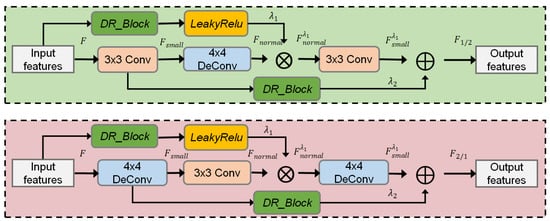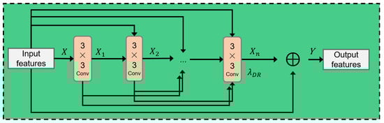 DR_Block is inspired by DenseNet [19] as shown in Figure 3. Each layer (to compute features ) connects to the previous layers and incorporates their results. The computed is then added with weight element-wise to the input features X to obtain the output features Y. It enables the network to effectively propagate and retain features. In this paper, we use a sequence of convolutional layers with a stride of 2, (the weight of ) is set as , and n is set to 2 due to its frequent usage.