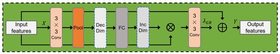 GR_Block is inspired by OIDDR-Net [20]. As shown in Figure 4, it uses a multiscale feature extraction method to guide the network to optimize the feature map while maintaining the correspondence between the image and the input features. First, the input X is connected to a convolutional layer with a stride of 2 to extract features, then a pooling layer is applied for dimension reduction from to . The output is then added to a fully connected layer to further extract features. Next, they are upsampled from to , and the obtained features are multiplied by the input features X. The resulting output is then inputted to a convolutional layer with a stride of 2 and added element-wise (with weights ) with the input feature X to obtain the output feature Y of the GR_Block.