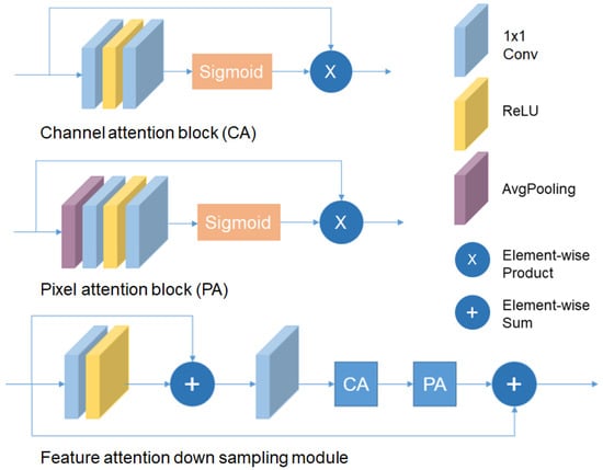 To consider the importance of the spatial information associated with the features, inspired by S3Net [14], we introduce the feature attention downsampling module (FADM) as the attention emphasizes the contextual information. As shown in Figure 6, the FADM combines a channel attention block (CA) and a pixel attention block (PA) to form a network module [21].
