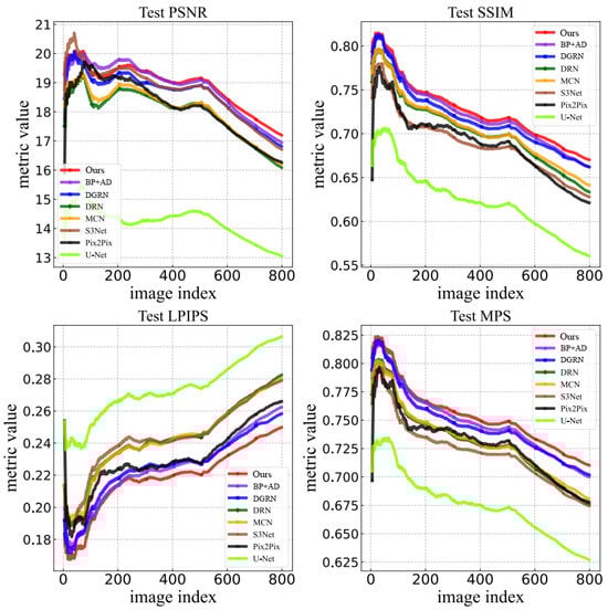 Comparison with other representative methods on the test set of 800 images. The horizontal axis of the graph represents the sequence number of the 800 test images, while the vertical axis represents the values of the evaluation metrics.