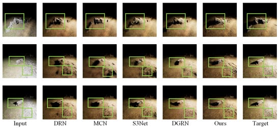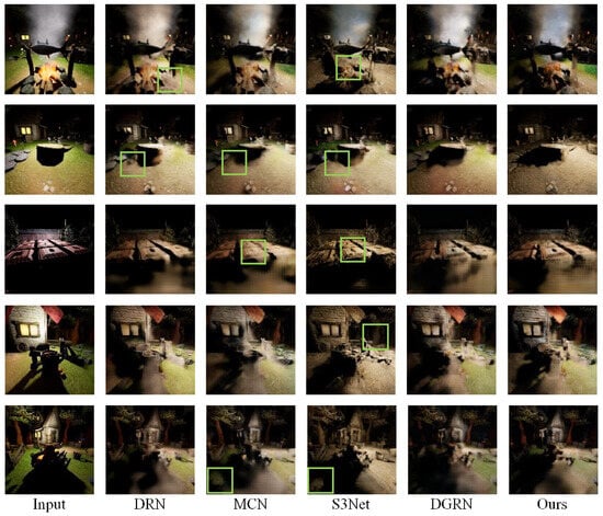 We compare the results using our method DGATRN with these representative methods: U-Net [24], Pix2Pix [2], Retinex-Net [9], DRN [11], MCN [13], and S3Net [14]. We also include the results of the method by taking away the attention and transfer modules from DGATRN, namely DGRN, as well as results from the baseline method with attention added to the residual sampling blocks, namely BP + AD.