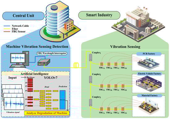 Conceptual schematic diagram of FBG integrated with YOLO V7 in the smart industry with a distribution unit and a control unit as a central unit for the PCB Factory, electric vehicle factory, and material factory. (PCB: Printed circuit board, FBG: Fiber Bragg grating).