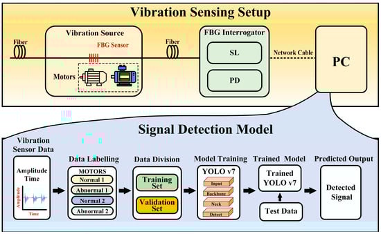 In Figure 2, the experimental setup is a real experiment in which vibration sources have two kinds of independent motors with four conditions or faulty signals, as shown in the data labeling section of the signal detection process. FBGs are used for collecting vibration using an FBG interrogator with a swept laser (SL) and photodetector (PD). Single-mode fiber cable connects the FBG sensor and the FBG interrogator, and the network cable transmits data to the PC. The signal detection algorithm collects that data and processes it, further training the algorithm. YOLO V7 algorithm is embedded here for detecting the faulty signal. A trained model also can be used for real-time detection of test data. Below, we have described every parameter of the signal detection system of this experiment.