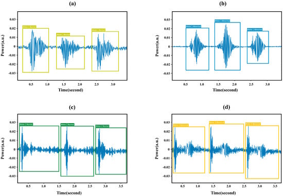 In Figure 3a–d prediction results of YOLO V7, the bounding boxes highlight the target signals generated from industrial machinery motors. The bounding box prediction is dependent on both the anchor box size and the feature information outputs of the network. The size of the anchor box also referred to as the a priori box, is established through prior experience. The network’s prediction information adjusts the position of the preceding box to yield the predicted bounding box. The process of creating prediction boxes using test signals is illustrated in Figure 3. The four kinds of different color bounding boxes reflect the results of different predicted classes. In Figure 3a inscribed by a light green color bounding box, is the predicted result of the proposed model when motor 1 is in a normal condition. On the other hand, in Figure 3b, inscribed by a blue color box, is the predicted result of the proposed model when motor 1 is in an abnormal condition. In Figure 3c, inscribed by a green color box, is the predicted result of the proposed model when motor 2 is in a normal condition. Furthermore, Figure 3d inscribed by an orange color box, is the predicted result of the proposed model when motor 2 is in an abnormal condition.