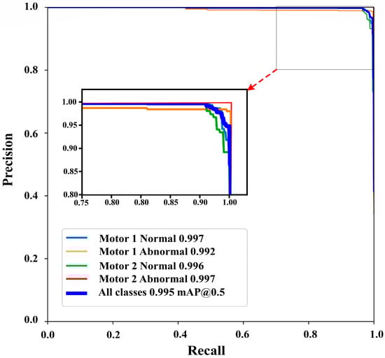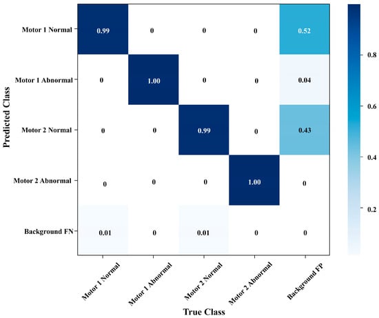 The proposed algorithm evaluated the performance of the signal detection model (YOLO V7) on the vibration dataset, as shown in Figure 4 and Figure 5. The four classes are accurately classified using YOLO V7, and each class’s separate accuracy is shown also at the precision-recall relation curve, confusion matrix, and Loss graph. The result of each class is as follows: motor 1 normal, motor 1 abnormal, motor 2 normal, and motor 2 abnormal is shown in the confusion matrix, with the detection result of false negative and false positive with respect to each class. Besides that, a precision-recall curve assesses the performance of the detection model for correctly identifying the positive detection with fewer false positives. The curve precision highlights the true positive to the predicted positive and, meanwhile, the ratio of true positive to actual positive. The area under the curve (AUC) reflects the performance. As a result, high precision shows the accurate positive vibration signal and minimal false positive degradation signal. In Figure 6, the loss graph displays the training and validation loss curve, with the blue curve representing the training loss and the red curve representing the validation loss. Loss is a function that consists of bounding box loss, confidence loss, and class loss. It is calculated by the addition of a bounding box, confidence, and class loss. Bounding loss is a prediction of the accurate coordinates of the box; it is also known as localization loss. Confidence loss is also known as objectness loss, which is defined as the prediction of the object in the grid cell or anchor box, and class loss predicts that object contained in the bounding box. The main focus of the three losses are increased accuracy of classification, localization, and signal detection. In the experiment, when we calculate the loss, it consistently decreases during the training and validation of the signal detection model. The training and validation loss converg approximately at 75 epochs. In addition, during the training validation time, the model at 160 epochs was totally stable, and loss was minimal. As Figure 6 shows, at every epoch after 75 epochs, the loss curve was continuously in progress until optimal epochs. Our loss result was optimal at 195 epochs. Along with a learning rate of 1 × 10−5, momentum was 0.98, weight decay was 0.001, batch size was 16, the optimizer was Adam, the image size was 416 × 416, and total epochs were 200. When 191 epoch loss of validation 0.0005 approximately which was the best loss and performance was quite impressive as shown in the figures below.