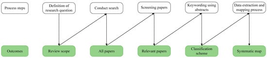 To gain a deep understanding of the current research status and the latest developments in the research field and provide the theoretical support required by subsequent researchers, a literature review method needs to be adopted to conduct a thorough and effective summary of the field. Currently, researchers have proposed some convenient and effective literature review methods, including systematic literature review (SLR) [], systematic mapping study (SMS) [], and systematic review (SR) []. An SMS is a method for categorizing and summarizing the literature in a specific thematic area. It can provide a comprehensive and objective perspective on the thematic area, help identify research trends, research gaps, and future research directions, and provide guidance for subsequent SLR or other research. The classification results are usually processed graphically and can provide a visual representation of the results. Given the advantages of the SMS method, this study opted to employ it for conducting a comprehensive review of the research domain. This approach enables a comprehensive understanding of the current state and trends within the field, providing valuable guidance and insights for subsequent research endeavors.