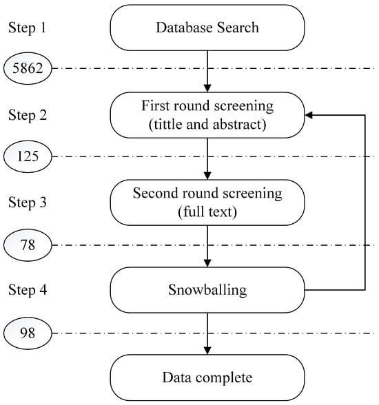 Initially, the first round of screening involved reading the titles and abstracts to determine the relevance of each paper to the research topic. As a result, 125 papers were identified for further consideration. These selected papers underwent a second round of screening, involving a thorough examination of the full text, resulting in the retention of 78 papers. Furthermore, the snowball method [] was employed to supplement the second round of screening, leading to the discovery of an additional 20 papers. Through a series of rigorous screening stages, a final set of 98 papers was ultimately chosen as the focal point of this study. The specific steps of the selection process are illustrated in Figure 2.