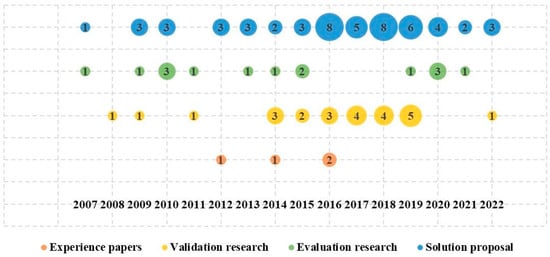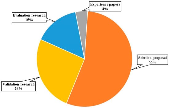 This study classified the selected papers according to the paper classification framework proposed by Wieringa et al. []. According to this classification framework, research types (RT) can be divided into six categories: solution proposal papers, validation research papers, experience papers, evaluation research papers, opinion papers, and philosophical papers.