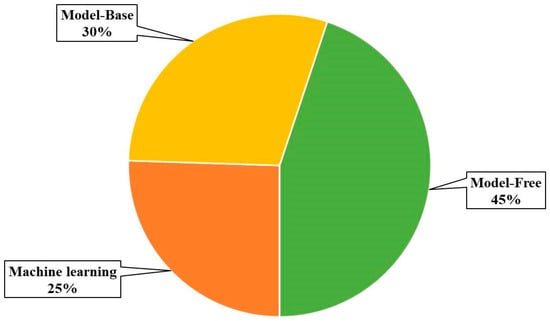 Categorizing the prediction methods into three categories: model-free prediction, model-based prediction, and machine learning. As shown in Figure 6, of the 98 articles screened, 44 articles covered model-free prediction, accounting for 45% of the total, 29 articles covered model-based prediction, accounting for 30% of the total, and 25 articles covered machine learning, accounting for 25% of the total.
