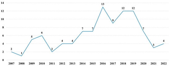Based on the selected articles, this study analyzed the research trends in the field of EHWS. As shown in Figure 7, the number of publications gradually increased from 2011 to 2016. Among the years we selected, the publication rate in 2008 was the lowest with only one article, while in 2016, the publication rate was the highest, reaching 13 articles. The research hotspot in this field was between 2016 and 2019, with about 10 papers published each year. From 2019, the number of publications decreased annually, but there was a resurgence in 2022. Overall, this study believes that there is still high research significance in the field of EHWS, and researchers can further explore this area.