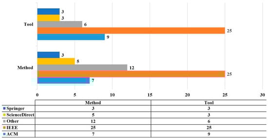 Figure 8 displays the number of tool and methodology-based papers published by different publishing units. From the chart, it can be observed that the number of tool papers and methodology-based papers published in Springer and IEEE is the same. The number of tool papers published in ACM is greater than the number of methodology-based papers. For the remaining publishing units, the number of methodology-based papers is fewer than the number of tool papers. Among the selected 52 methodology-based papers, the main objectives of these methods were twofold: (1) to propose new methods to provide more referenceable prediction methods for the current research field, and (2) to improve the existing methods to enhance prediction accuracy or reduce complexity.