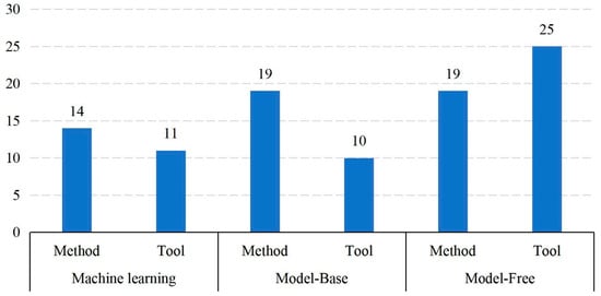 Firstly, it can be observed that the highest number of tool papers belongs to the model-free prediction method, reaching a total of 25 articles. Secondly, for the method papers, both the model-free and model-based prediction methods have 19 articles each. This indicates that the model-free and model-based prediction methods have received similar attention in terms of technique papers. These different methods may apply to various application scenarios and levels of problem complexity. The number of papers on machine learning prediction methods is the lowest, with only 14 articles. This can be attributed to the particularity of the energy-prediction field and the requirements for data and models, which may result in the relatively limited application of machine learning methods.