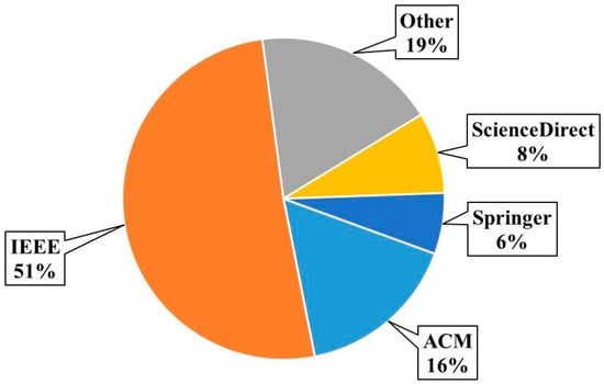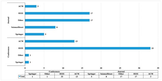 According to the publication types, this study classified the selected papers into two categories: international journals and international conferences. By classifying the 98 pieces of relevant literature into different types, this study found that 51% of the paper types were conference proceedings and 49% were journal publications. Additionally, this paper analyzed the publisher labels and publication types and plotted a chart, as shown in Figure 10. It can be seen that the number of conference papers published by IEEE and ACM is significantly higher than that of journal papers, while the number of conference papers published by other publishers is significantly lower than that of journal papers. It is worth noting that the authors’ preference for journal publications and conference proceedings is similar, indicating that the number of journal platforms and conference platforms in this field is similar, with relatively balanced academic exchange opportunities.