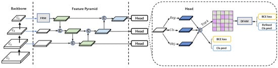 Illustration of the whole architecture of our proposed network. FRM and DFAM are integrated into the model’s FPN and detection head, respectively. FRM refines the deepest feature and guides the shallow feature. The detection head selects features by top-k, inputs them into the DFAM module, and calculates the loss after feature aggregation.