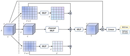 The features encoded by the learnable key–value parameters are then entered into an activation function and a linear layer, and the output of the first branch is obtained by multiplying and then adding the features (the feature before being encoded by key–value parameters and the feature entered into the first branch) in the form of residual linkage. in Equation (4) denotes the ReLU activation function.
