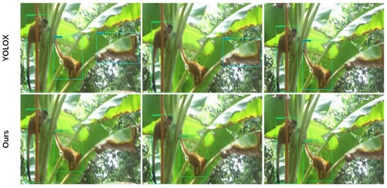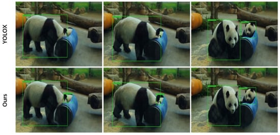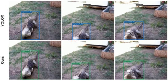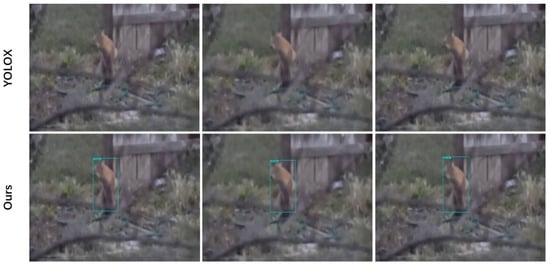 Comparison with existing VOD methods. Table 2 shows the detailed comparison information between our proposed method and existing VOD methods. It can be seen from the results that our method achieves 83.3% in AP50. Our proposed method exceeds most two-stage detector-based VOD methods, such as SELSA () and ST-Lattice (). Our proposed method also exhibits better performance than the one-stage detector-based VOD method in accuracy. Our proposed method shows better performance when compared with optical flow estimation methods, such as FGFA () and OGEMN (). Thanks to feature-refining, our proposed method overcomes the influence of low feature quality on dense prediction tasks to a certain extent. Dynamic feature aggregation also effectively aggregates the temporal features and improves the detection of the current frame in a targeted manner. Figure 5, Figure 6, Figure 7 and Figure 8 show a comparison between the proposed method and the base detector.