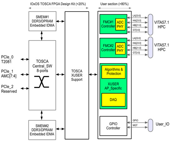 The IFC1410 FMC carrier is delivered with a dedicated firmware framework called TOSCA. It provides easy-to-use firmware interfaces for all available on-board peripherals and FMCs together with a dedicated Linux driver and command line applications. The user of the board can focus on custom implementation of required functionality without the detailed knowledge on exact interfaces. The general block diagram of the framework is presented in Figure 3. The blocks indicated by the green colour are dedicated for user implementations and the white ones are part of framework itself. The blocks implemented in the scope of this work are marked in yellow.