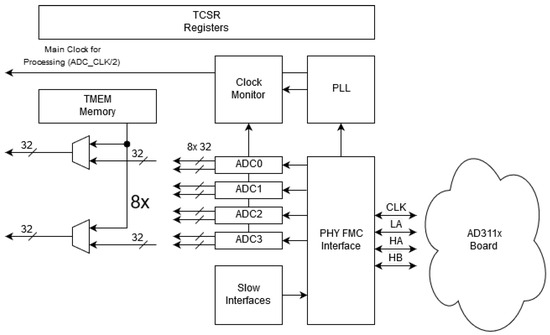 The block diagram of the board is presented in Figure 4. As part of the work, the dedicated ADC interface has been implemented using the VHDL language—it is capable to interface with high-speed ADCs using a data rate of up to 1 Gbps per single differential pair. The interface is based on ISERDES FPGA primitives with additional clock and delay calibration modules. The data are provided to further FPGA blocks using double-word data path to decrease clocking requirements. In addition, several diagnostic and control blocks have been implemented—this includes the PLL configuration, clock frequency monitors and pattern generators.