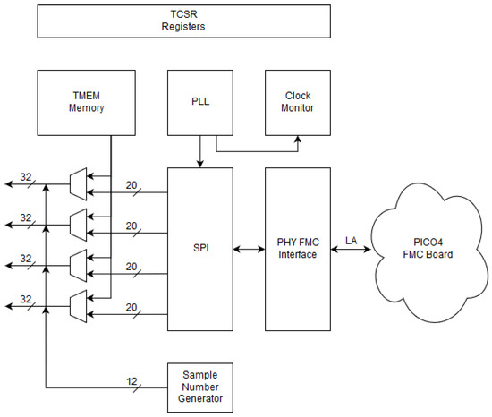 The ionization chambers used as detectors for ICBLM systems have completely different requirements. The system operates in current mode—the current produced by the ionization chambers scales with the flux of the incoming ionizing radiation that traverses the detector active area and has a very high dynamic range—from less than nA to a few mA. The FMC-PICO-1M4-C1 [16]—a 1 MSPS 20-bit ADC card compatible with the IFC1410 platform—has been selected for the application as one of the few on the market, which fulfills the dynamic range requirements. The block diagram of the board is presented in Figure 5. The ADC is equipped with an SPI serial interface with strict requirements on interface timing to ensure the proper quality of the sampled data. The exact tuning of the sampling point, SPI transactions and wait time has been conducted using a 3 ns resolution state machine.