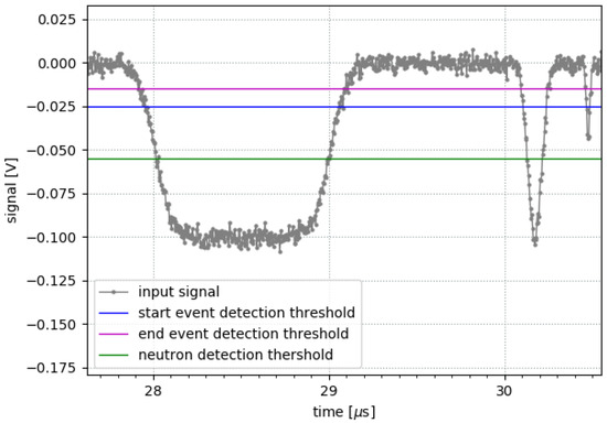 The signal produced by the detector has the shape of a series of negative pulses (see Figure 6) that are generated directly or indirectly by incoming particles that interact with the detector’s sensitive volume. If the signal during the pulse drops below the predetermined event detection threshold, it is interpreted as the start of an interesting event (Figure 7). The following parameters are obtained from interesting events for further analysis: