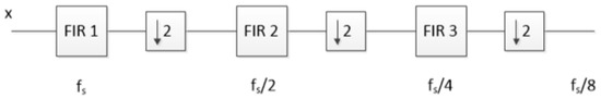 The detection of <1 Hz frequencies in the 1 MHz data stream using an FIR low pass filter would require a few millions of coefficients—the decision has been made to reduce the data sampling rate to 1 Hz before further processing. This is accomplished with a dedicated decimator with anti-aliasing filters. The structure of the decimator is presented in Figure 10. The decimator consists of 20 FIR-downsampler pairs.