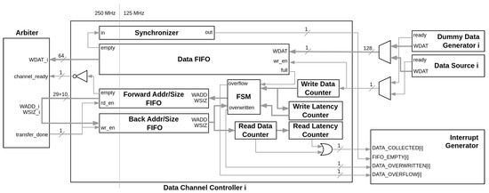 Since both BLM systems share many functional elements on the hardware level, several firmware components are reused in both of them. One of the common parts is data stream controller implementation, which provides the possibility of continuous data acquisition into the external memory banks. Its structure is presented in Figure 11. It is equipped with the dedicated FIFOs, which provide data buffering capabilities as well as clock domain crossing infrastructure among data acquisition and memory clocks. The TOSCA framework uses a custom protocol, allowing the writing of data blocks in bursts of a specific size at the clock frequency up to 300 MHz. To obtain good write performance, a burst size of at least 2048 bytes is necessary. Therefore, the data are stored in the FIFO until a full burst transfer can be initiated. In addition, there is a latency timer, forcing a flush of incomplete burst if a specified amount of time has passed since the last transfer. The operation is controlled by the dedicated state machine with write and read counters. The operation status and dedicated interrupts are provided to the outside for monitoring.