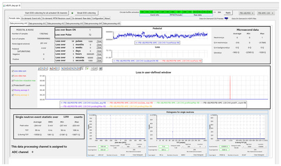 The nBLM DAQ prototype that was tested was at an early stage of its development with a functioning NDA and the ability to manually trigger the extraction of data at various stages of processing, including the raw unprocessed data stream in a time window of up to 2 s. The prototype lacked the periodic data monitoring features, but the main processing chain was in the final version. An example of raw signal with pedestal correction applied that was acquired during this campaign is shown in Figure 6.