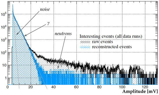 The distribution of number of interesting events vs. pulse amplitude, extracted via the offline analysis, is shown in Figure 17. Note that some pulses had to be split in the real-time processing, so reconstruction of recorded events (merging events at MTW boundaries) was needed to obtain the real pulse characteristics, resulting in the differences seen at higher amplitudes. The reconstructed distribution has the expected shape with the first slope due to noise, and the second slope due to particles mainly caused by the RF and neutrons dominating at amplitudes above ∼30 mV, as shown in Figure 17. This agrees with the results obtained from the oscilloscope data [24] with minor differences in the shape caused by more advanced offline analysis carried out on the oscilloscope data.