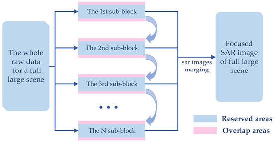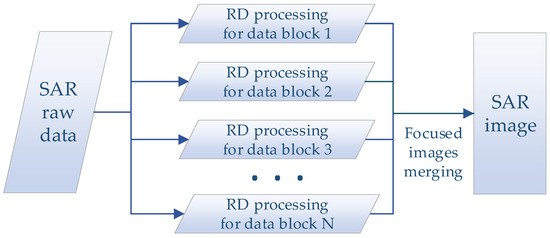 Using this feature, to further improve the processing efficiency, a parallel scheme for processing a large amount data using the RD algorithm. The flow chart of our parallel scheme is illustrated in Figure 1. The raw echo signal is divided into N blocks according to the azimuth sampling points, and each divided data block is processed with the RD algorithm at the same time. Since the range sampling point of the raw echo signal is not changed, all the data blocks can be easily merged after SAR imaging processing. Our scheme allows a good combination of the characteristics of SAR systems with a parallel acceleration technique. For example, our parallel scheme is applied to SAR raw data with 8000 and 27,000 sampling points in the azimuth and range directions, respectively. The sampling points are divided into four equal data blocks along the azimuth direction. The results show that our parallel acceleration method takes only 34.1% in comparison with the serial processing time, resulting in a significant improvement in processing efficiency.
