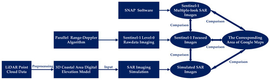 Coastal areas include land and sea surfaces, with buildings, hillsides, and roads on land as well as piers and bridges on water. It is difficult to model the real coastal areas because the structure of the coastal areas is complex. Light Detection and Ranging (LiDAR) point cloud data have the advantages of high resolution and sufficient available data, which are suitable for constructing complex 3D coastal area models. Therefore, in this paper, we process the Light Detection and Ranging (LiDAR) point cloud data by denoising and down-sampling, and then, we triangulate the LiDAR point cloud data to establish a 3D model of the coastal areas. Based on this model, we use the ray tracing method to realize the simulation of spaceborne SAR imaging. The block diagram of a comprehensive comparative study for coastal areas is illustrated in Figure 2.