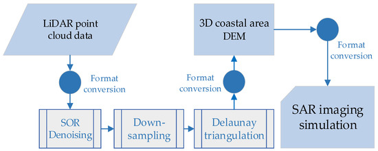 In order to model the real coastal areas, a scheme is proposed to convert the point cloud data of the coast into a 3D coastal area DEM. The point cloud data with higher accuracy are more beneficial for modeling realistic coastal areas. The resulting DEM mesh can be utilized as an input geometrical model for SAR imaging simulation. The approach is to perform SOR denoising and down-sampling of LiDAR point cloud data, followed by Delaunay triangulation to generate a 3D coastal area DEM, which is used as a target for SAR imaging simulation. The flow chart of our approach to modeling the 3D coastal areas is shown in Figure 3.