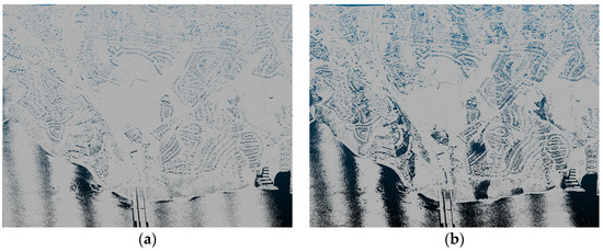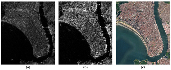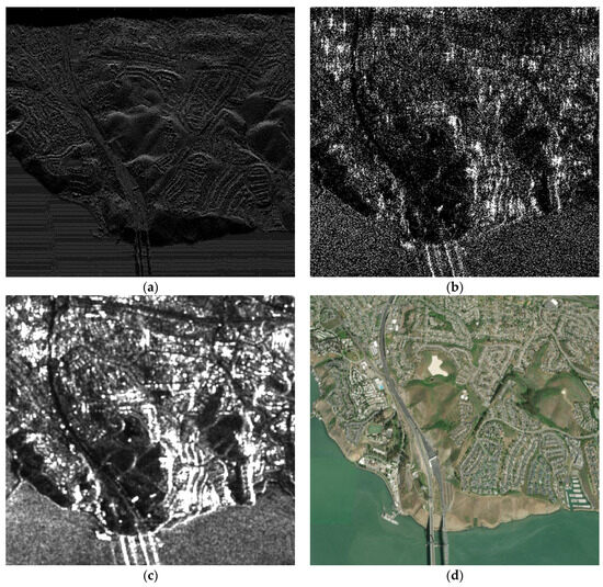 However, the sliced SAR images in Figure 13a and Figure 14a are slightly blurred, and the details such as the main road and the land edge are difficult to identify. Therefore, image enhancement technology is applied to increase the contrast between the strong and weak reflection points in SAR image, to optimize the definition of the sea and land contour, and then to brighten the image. Hence, the local SAR image after magnification is still clear. Figure 13b and Figure 14b are the sliced SAR images after enhancement. From Figure 13 and Figure 14, the effect of SAR image enhancement can be observed. By comparing the sliced SAR image and the corresponding areas of Google Maps, the results show much better agreement after image enhancement.
