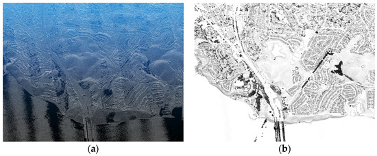 Simulated SAR image of coastal areas of Vallejo City obtained with RaySAR: (a) simulated SAR image with double bounce contributions; (b) simulated SAR image with first five bounce contributions.