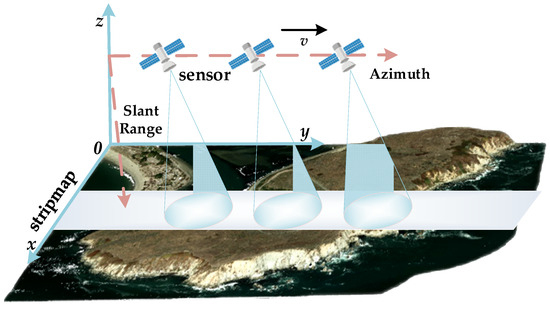 On the basis of the coastal areas modeling aforementioned, SAR imaging simulation can be performed. The schematic of stripmap SAR is depicted in Figure 6. Stripmap mode is the most basic SAR imaging mode, in which the radar antenna remains fixed in a pointing direction. The imaging area is a ground strip parallel to the direction of movement of the radar sensor platform. The width of the imaging band can be changed, ranging from several kilometers to hundreds of kilometers. Our main purpose is to make a comparison between the focused image processed using real SAR raw data and simulated SAR images. Therefore, we will use a SAR simulator for SAR imaging simulation on the basis of our geometrical model built using LiDAR point cloud data.