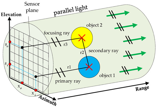 The SAR imaging system of RaySAR is approximated using a cylindrical light source and an orthographic camera. Figure 7 shows a schematic of ray tracing, and the process of double reflection of ray is also described. The reflection contribution is evaluated with the backward ray tracing technique, that is, light starting at the sensor and ending at the signal source. By this way, rays that do not intersect the scene and cannot reach the light source are not traced. Compared with the forward ray tracing, the computational complexity is greatly reduced, and the computational efficiency is improved.