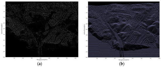 The raw data are formatted and decoded, and the echo signal and related parameters are extracted. The raw echo signals are shown in Figure 10a,b. Figure 10a corresponds to the data of the first scene, with 21,838 sampling points in the range direction and 48,941 sampling points in the azimuth direction. Due to a large amount of data leading to memory shortage, the data block ranging from the 8000th row to the 18,000th row in azimuth direction are selected, in order to save memory requirements. Figure 10b corresponds to the data of the second scene. The sampling points in the range direction are 22,018, and the total sampling points in the azimuth direction are the same as the first scene. Starting from the 2000th azimuth row, the next 10,000 rows of raw echo signal are selected for SAR imaging processing.
