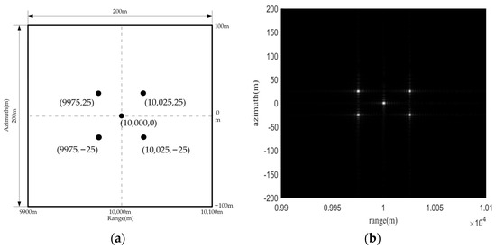 To establish the imaging model, we will perform a SAR imaging simulation of point targets. The squint angle of the simulated radar is zero, and the platform equipped with the antenna scans the ground target in the way of side-looking. The carrier frequency is set to 5 GHz. The bandwidth is set to 200 MHz, and the range sampling rate is set to 320 MHz. The platform carrying the radar is placed at an altitude of 10,000 m above the ground, and it is made to fly in a straight line along the azimuth direction at a speed of 100 m/s. The radar imaging area is set as a rectangle of 200 m 200 m. The imaging area is (9900 m and 10,100 m) in range direction, and the scope is (−100 m and 100 m) in the azimuth direction. Figure 9a shows the SAR imaging area and the coordinate settings of five-point targets.