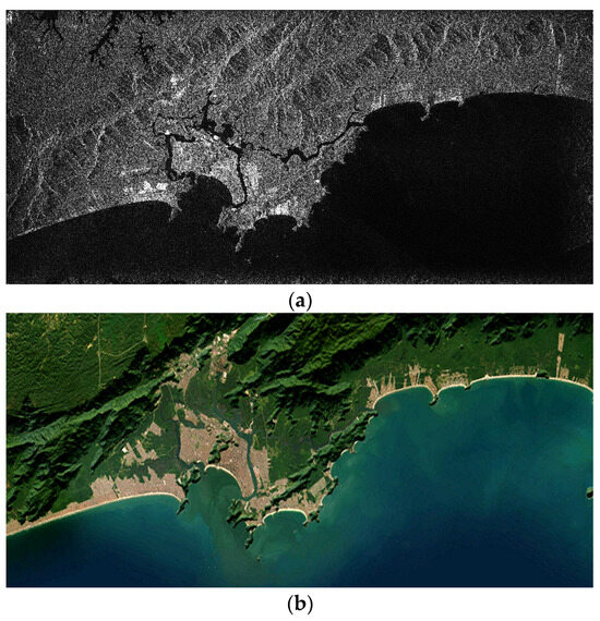 Comparison between the focused SAR image for the first scene and the corresponding areas of Google Maps: (a) SAR image focused on Sentinel-1 raw data for the first scene; (b) the Santos City, Sao Paulo state, Brazil, in Google Maps.