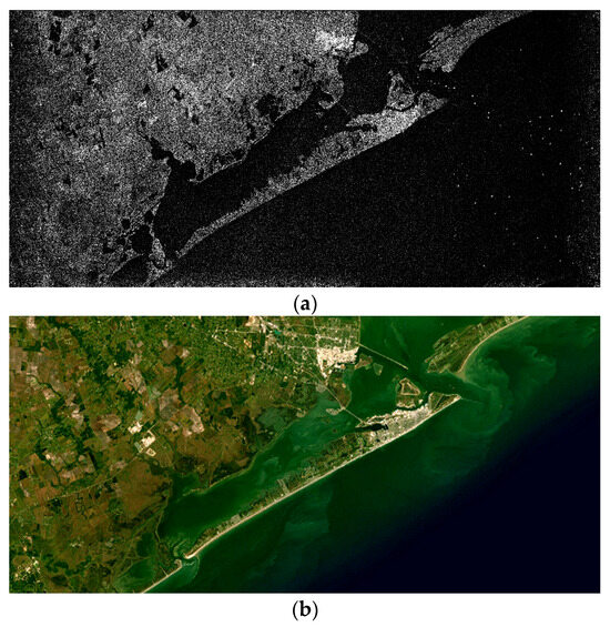 Comparison between the focused SAR image for the second scene and the corresponding areas of Google Maps: (a) SAR image focused on Sentinel-1 raw data for the second scene; (b) the Galveston County, Houston, USA, in Google Maps.