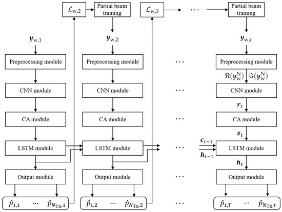 Specifically, in the channel attention-assisted enhanced adaptive CBT scheme, to identify wide beams for the t-th wide beam training session, an auxiliary LSTM module is utilized. The auxiliary LSTM module anticipates the t-th optimal wide beam index ahead of time, leveraging received signals from previous wide beam training sessions denoted as . The output of the auxiliary LSTM model is represented as predicted with wide beam probabilities, denoted as , with the wide beam having the highest predicted probability being determined as the best wide beam.