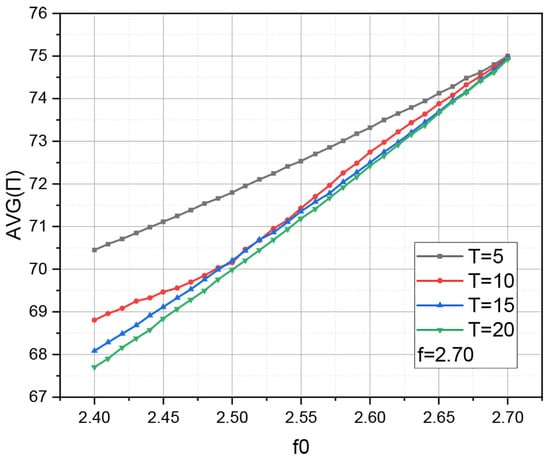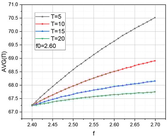 Finally, we will form a plan for experiments. We have already mentioned that we summarize the mathematical apparatus pressed down in Section 2 in the form of useful metric (9), (10) that allows us to estimate the target peripheral server’s energy consumption both at a specific moment (expression (9)) and for a censored time interval (expression (10)). The main characteristic parameters of the metric are the threshold (the capacity of the accepted for processing data packets queue), the base frequency (before the threshold is exceeded) and the operating frequency of the computing subsystem (after the threshold is exceeded), and time . Thus, in general terms, the power consumption of a peripheral server in the proposed metric is a function of four parameters, which does not allow us to present the results of experiments in one figure. Next, we will show how the metric (9) and (10) reacts to a change in each of the four characteristic parameters for fixed values of the corresponding three of them.