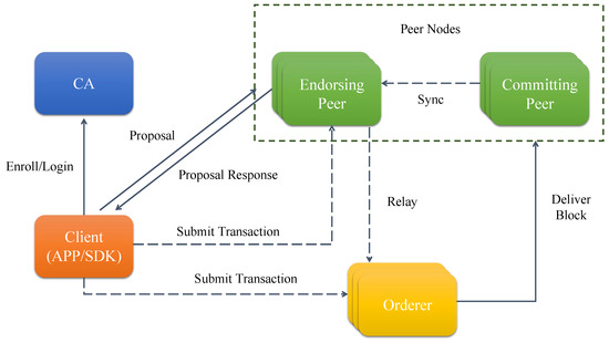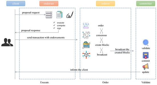 Transactions flow through the various components of the Fabric network and require the collaborative efforts of the nodes in the network, as illustrated in Figure 3. The EOV process starts when the transaction is proposed and ends when the transaction is submitted to the ledger [6]. First of all, the client creates a transaction and sends it to a number of endorsing peers. Once receiving the transaction sent by the client, each endorsing peer proceeds to execute the transaction against its own state database, ultimately computing the read–write set specific to that transaction. If the transaction is executed without errors, it signifies that the committed transaction has successfully passed the business rule checks. As a consequence, the endorsing peer will provide its endorsement, signifying its approval to the client. Later, the client waits for a sufficient number of endorsements and then sends the transaction with its endorsement to the orderer nodes that implement the ordering service. The ordering service returns a response to the client after the transaction has been accepted for inclusion in the block. The orderer nodes will reach a consensus on the order of incoming transactions and subsequently create individual blocks in succession from the ordered transactions based on the BatchSize and BatchTimeout parameters configured by the Fabric network. Once a block is created, the orderer nodes broadcast it to all peers who subsequently proceed to carry out the following procedures. The peers then validate all transactions within the block and commit the block to the ledger and state database once it has passed. In addition, one of the peers will notify the client that the transaction has been committed.