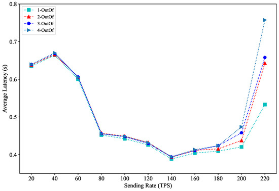 In the k-OutOf policy, the parameter k can be regarded as a variable with the range of any integer from 1 to N. The different values of k indicate the minimum number of endorsement signatures required in the endorsement policy. In order to explore the impact of different OutOf policies varying k on the transaction latency of a blockchain network, we test the average latency of four cases, 1-OutOf, 2-OutOf, 3-OutOf and 4-OutOf, as depicted in Figure 5. It can be found that, when the sending rate is at a relatively low value, the average latency of the four strategies is close with little difference. As can be seen from the figure, when the sending rate is at a relatively low value, from 20 TPS to 140 TPS, the average latency of the four policies is close with little difference. However, from 140 TPS onwards, the latency gap between different strategies has become noticeable and has been getting bigger. Overall, however, there is a trend that the larger the k, the higher the average latency at the same sending rate. That is, the larger the value of k becomes, the more endorsement signatures are required by the OutOf strategy, which means that it takes longer to collect enough signatures to complete the endorsement process. In other words, an increase in the value of parameter k leads to an increase in the number of endorsing nodes that need to provide endorsement signatures. Accordingly, the communicating latency in our proposed model becomes larger and thus the overall transaction latency becomes larger.