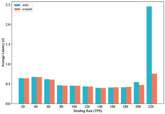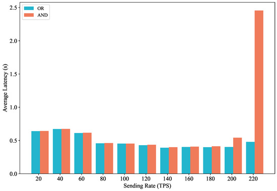 Due to their logical simplicity and ability to cover most application scenarios, OR and AND are two of the most commonly used endorsement policies. In this paper, we also compare the performance of a blockchain network under these two policies, as shown in Figure 6. From an overall point of view, the AND policy has a higher latency than the OR policy at different sending rates. In particular, we can observe from the figure that from 200 TPS, the average latency of the AND policy shows a substantial increase compared to the average latency of the OR policy. When the sending rate reaches 220 TPS, the average latency of the AND policy even reaches nearly five times that of the average latency of the OR policy. At this point, the Fabric network has reached a performance bottleneck for the AND policy and the transaction latency will increase rapidly. The definition of the AND policy determines that it usually needs to involve more endorsing peers compared to the OR policy, which results in the need to communicate with more peer nodes. The network overhead of interacting with more nodes has an impact on the performance of Fabric and increases the latency of the blockchain system. However, the AND policy, which requires all the endorsing nodes to provide signatures, also provides system security, to some extent, compared to other endorsement policies.