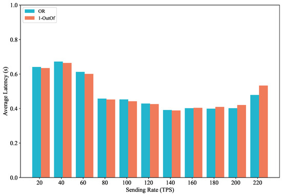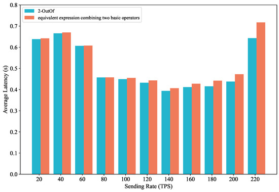 As Theorem 3 suggests in its finding, an endorsement policy expression can be transformed into an expression containing only the AND operator and the OR operator. This equivalent transformation will not change the meaning of the expression, but it will complicate it to some extent. Equation (12) is an equivalent expression of the 2-OutOf-4 policy. Therefore, we test the performance of the 2-OutOf policy and its equivalent expression as shown in Figure 9. As can be seen from the figure, the 2-OutOf policy and its equivalent expression maintain the same trend in the average latency under different sending rates. However, the average latency of the equivalent expression is consistently higher than that of the original expression. And the latency gap between the two expressions is also consistently increasing as the sending rate increases. The equivalent transformation of the endorsement policy leads to many more sub-expressions appearing in the expression, that is, it leads to the complication of the endorsement policy. Complexity makes it necessary for the endorsing peers to execute more computation and communication to validate the transaction, causing the endorsement process to become more time-consuming.