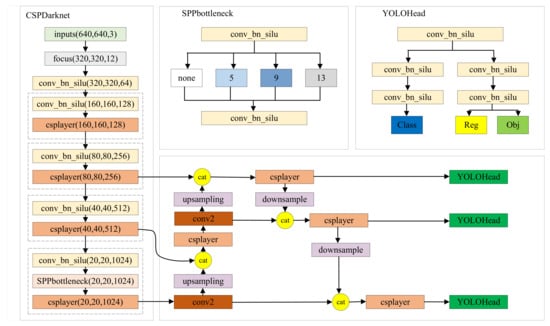 YOLOX is a new generation of object detection algorithm proposed by Megvii Technology in 2021. It shows significant improvements in performance compared to its predecessors, YOLOv3 [], YOLOv4 [], and YOLOv5. Compared to YOLOv7 [], which further improves the target regression rate by introducing an anchor box mechanism, YOLOX uses an anchor-free box mechanism to improve the model’s computational speed while maintaining detection accuracy. The overall network structure of YOLOX is depicted in Figure 1 [], consisting of three parts: the backbone network, the feature fusion network, and the prediction heads.